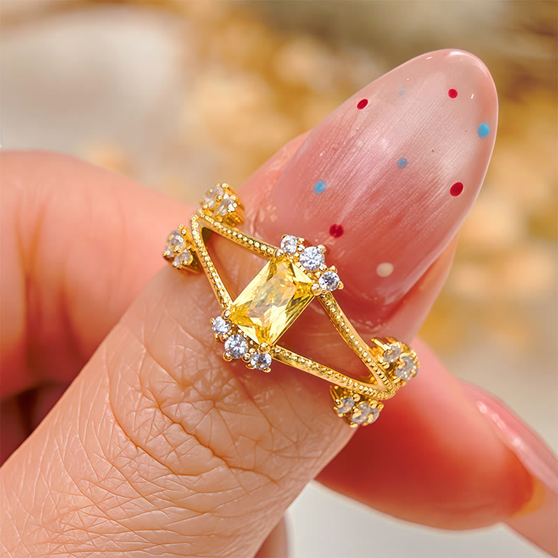 The "Golden Radiance" ring is a beacon of luxury and elegance. At its core, a brilliant citrine commands attention, its rich hue reminiscent of the warm, golden sun. Surrounded by a halo of sparkling gems set in a sumptuous gold band, it exudes a dazzling glow. This ring is not just an accessory; it's a statement of opulence, capturing the essence of timeless beauty and radiance.