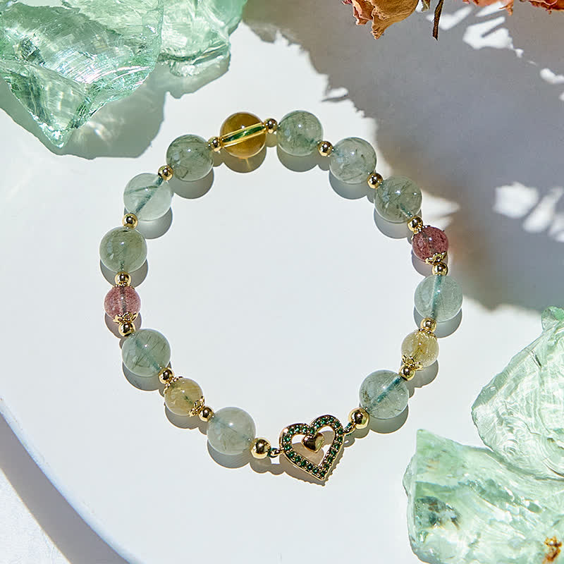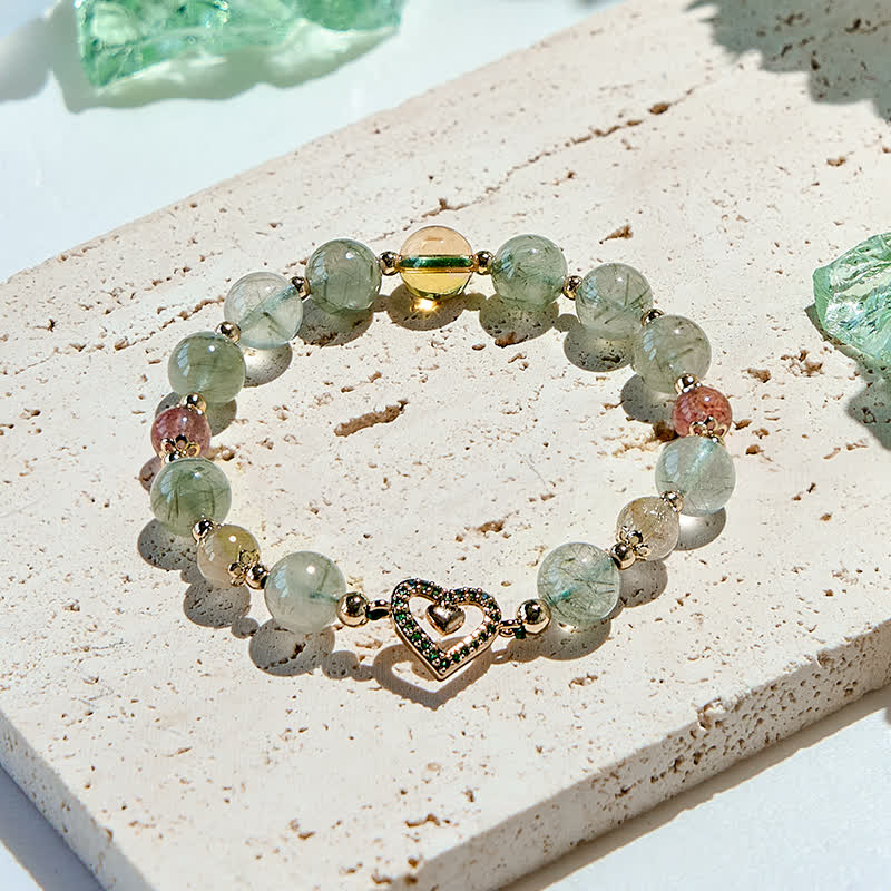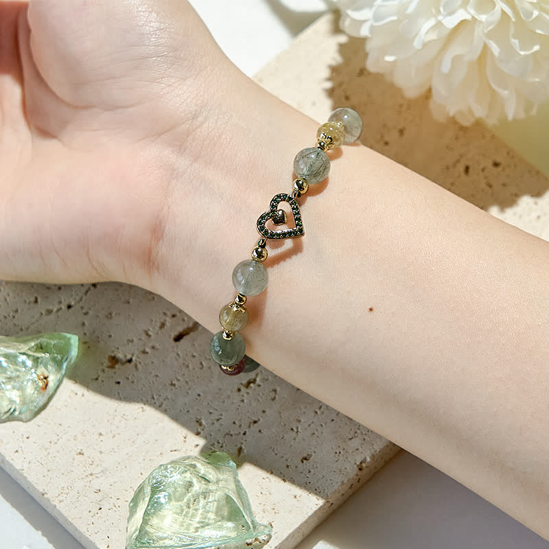Its green rutilated quartz beads, echoing lush moss, evoke the tranquility of verdant forests. Delicate golden accents and a heart-shaped charm—sparkling with intricate details—weave in romantic warmth, symbolizing love's gentle embrace.