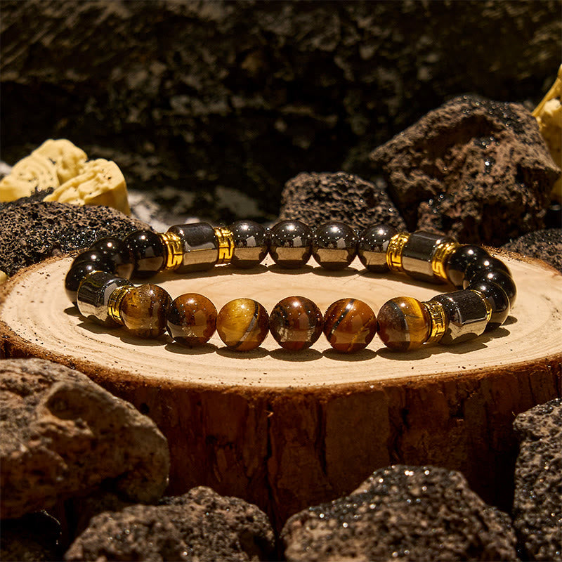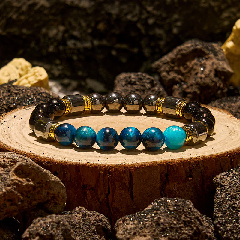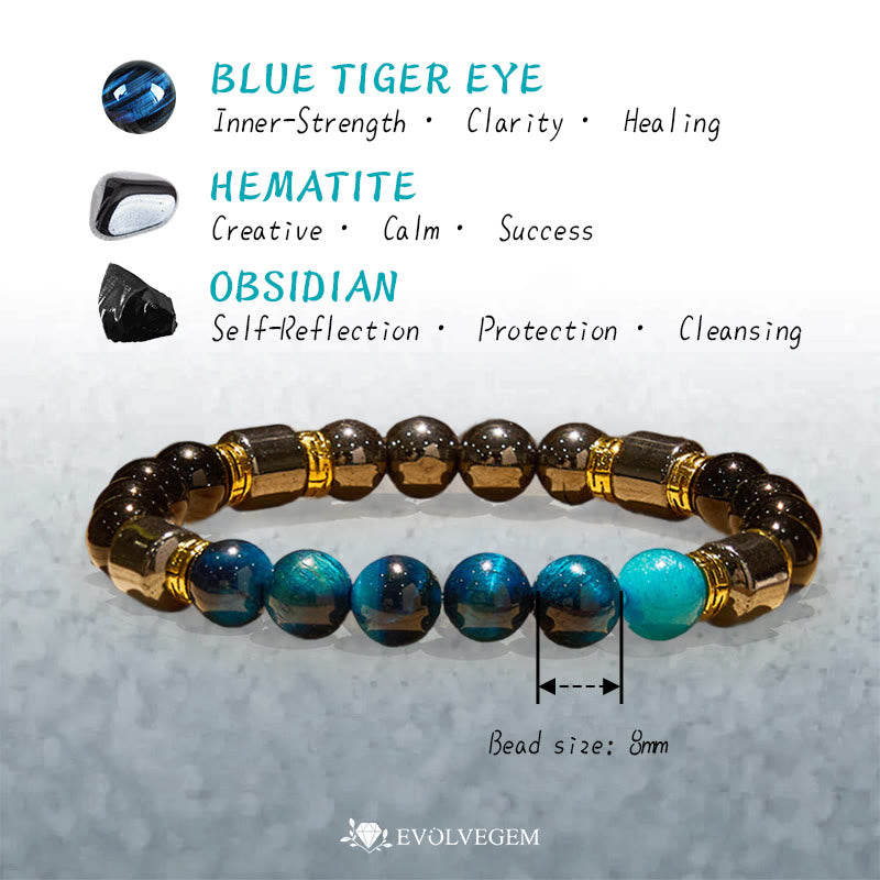 This "Terrazure Beads" bracelet harmonizes Tiger Eye (golden courage and clarity), Hematite (metallic grounding for focus), Obsidian (glossy protection against negativity), and Blue Tiger Eye (serene communication and emotional calm) into a single, wearable sanctuary. Each bead tells a story: Tiger Eye’s golden bands ignite inner strength, while Hematite’s iron-rich sheen anchors restless energy. Obsidian’s volcanic depth shields your aura, and Blue Tiger Eye’s oceanic swirls dissolve tension, inviting mindful dialogue.