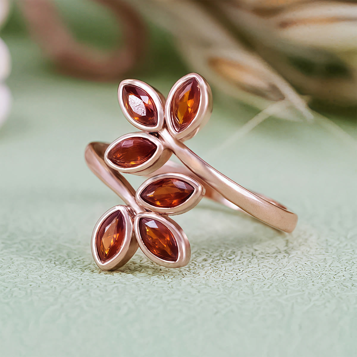 - Name: Evolvegem "Flammé Corolla" Garnet Leaf Ring