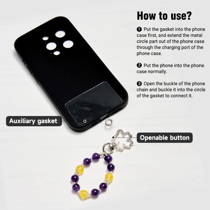 - Open the buckle of the phone chain and buckle it into the circle of the gasket to connect it.