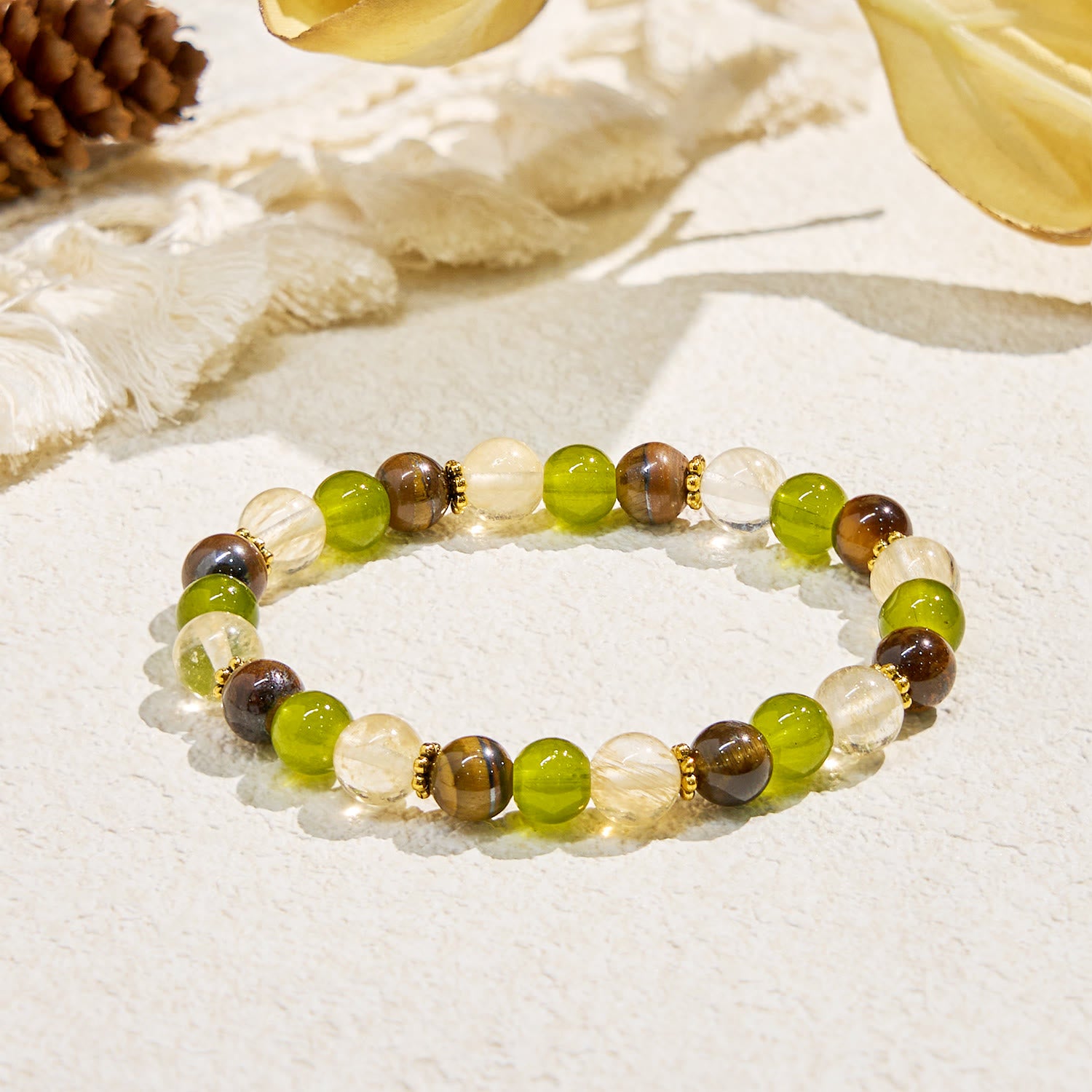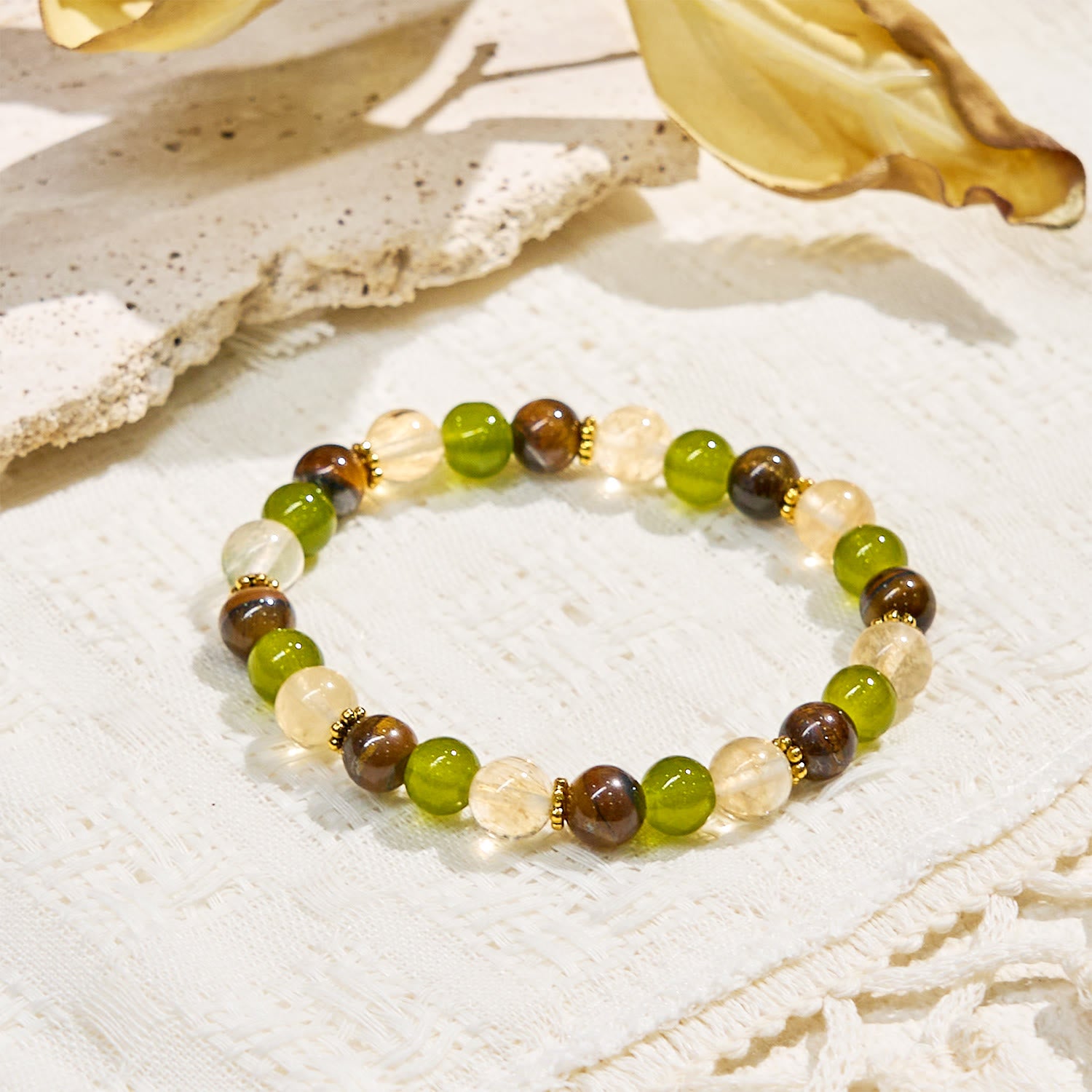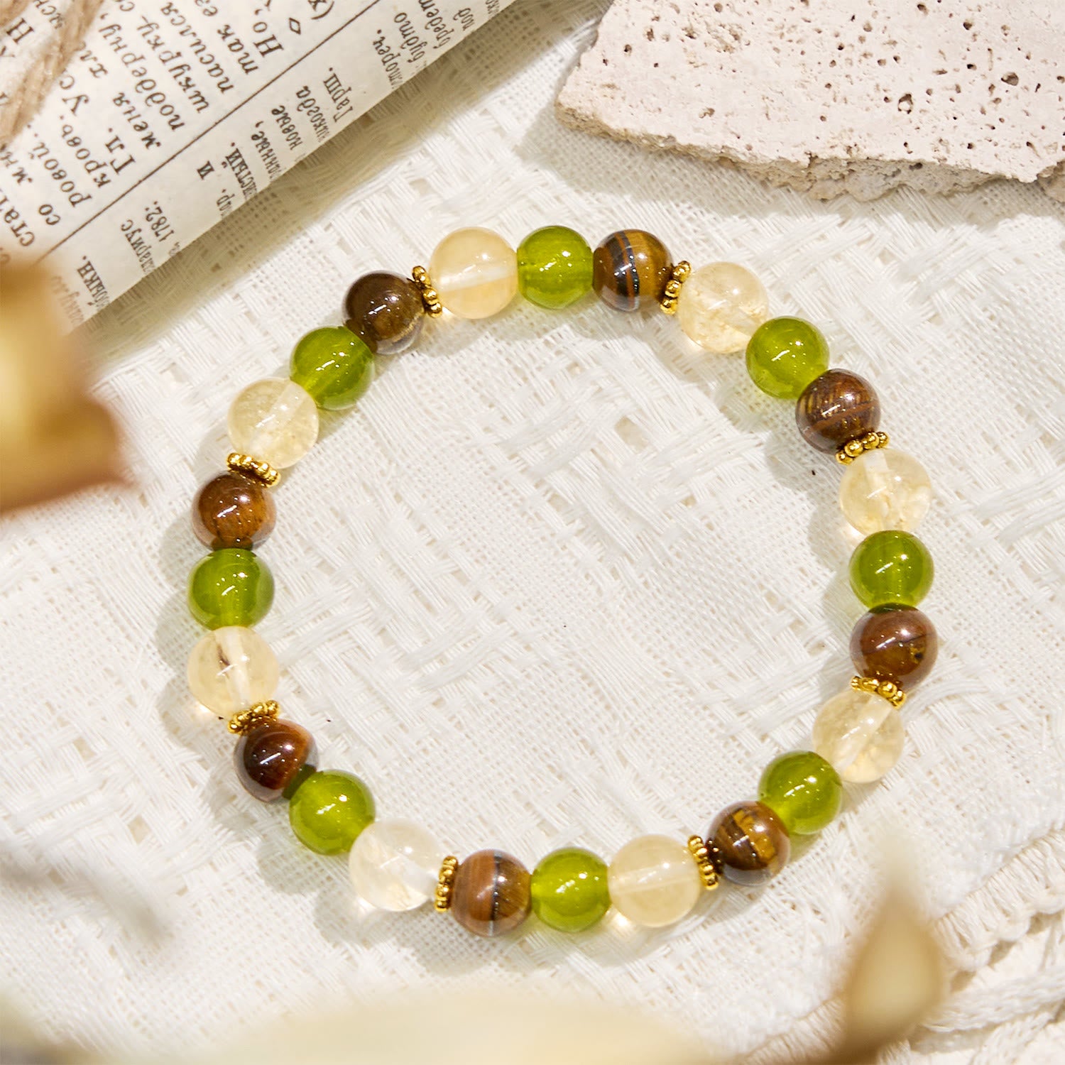 Sunlight filtering through an ancient grove—where Citrine’s golden glow captures the sun’s abundance, Peridot’s verdant spark mirrors life’s renewal, and Tiger Eye’s earthy bands hold the wisdom of time. Eden's Whisper weaves these natural treasures into a bracelet that hums with fortune.